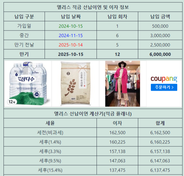 잘 나와있어서, 적금 가입하는 금액과 금리를 넣으면 내가 넣어야 할 납입 회차를 자동으로 알려주기 때문에 편합니다.