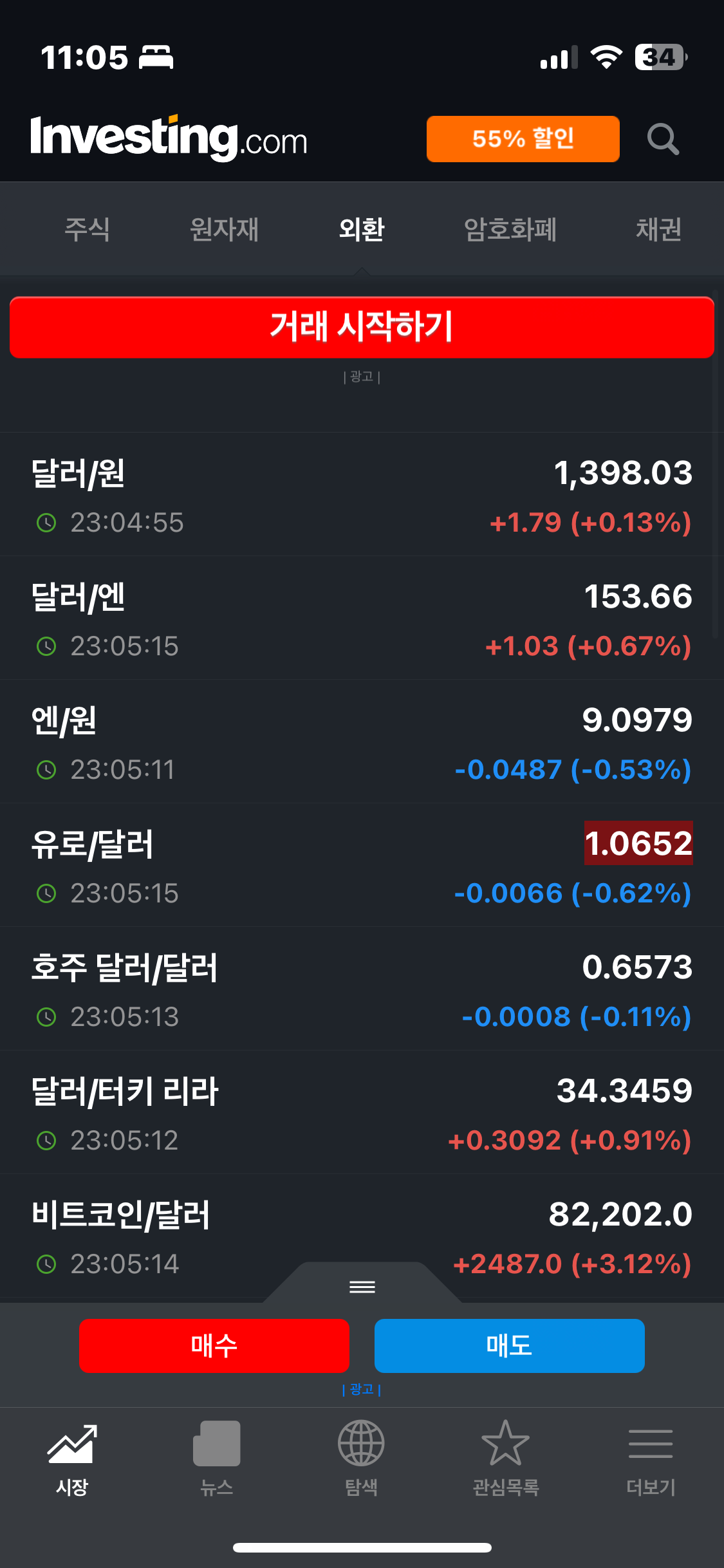 실시간 환율을 나타내는 인베스팅닷컴과