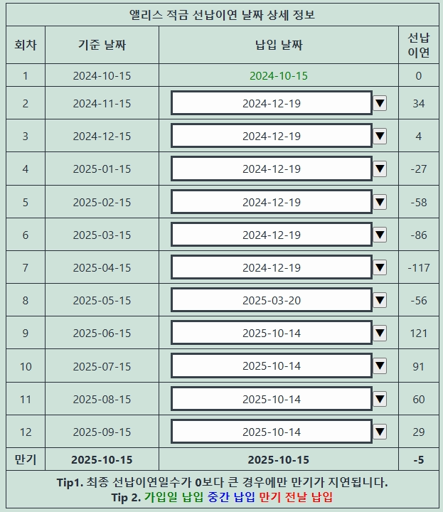 네이버에서 선납이연을 검색하면 선납이연 계산기가 많이 나오는데요. 저는 앨리스 적금 선납이연을 사용했습니다.